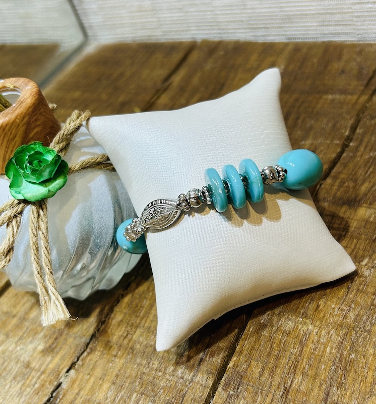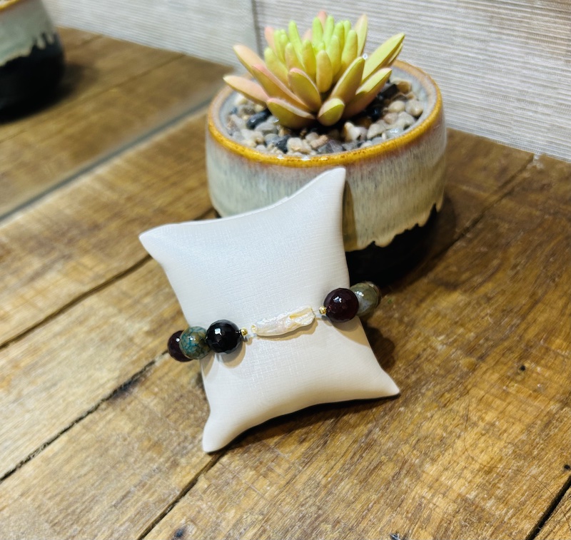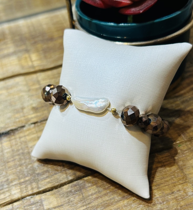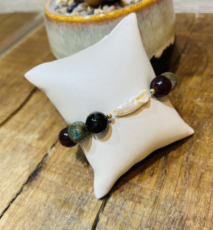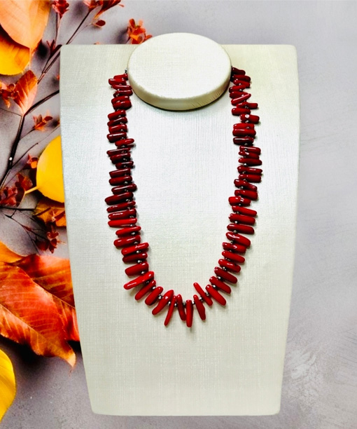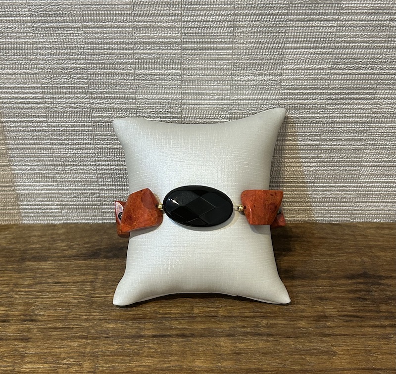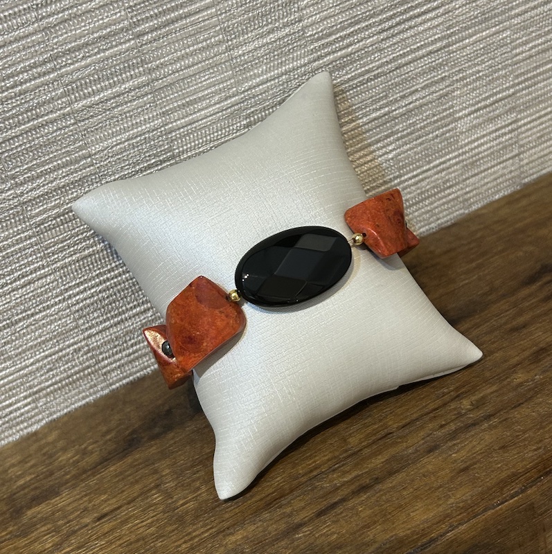 Feito com pedras hematita e coral e fecho em prata, com extensor.