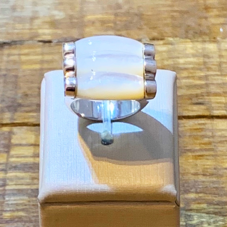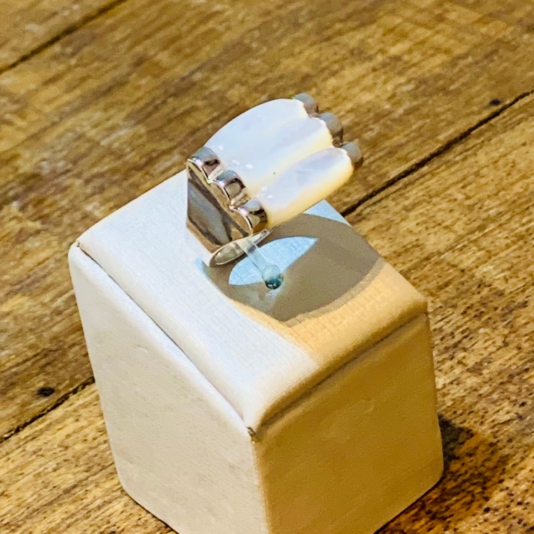 Descrição: feito com pedra madrepérola e metal com banho de ródio.
