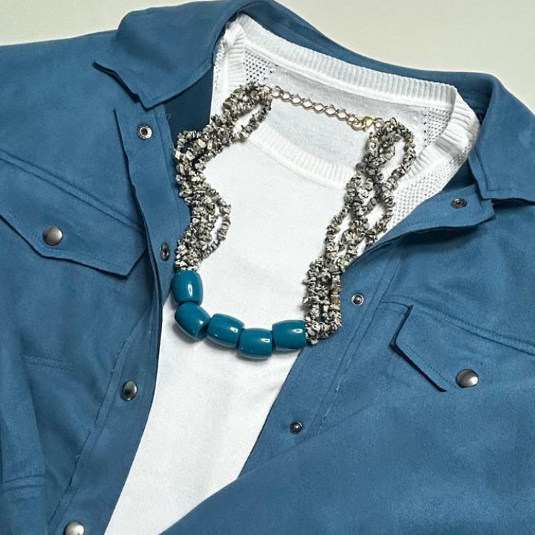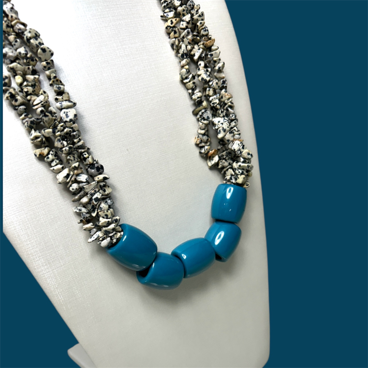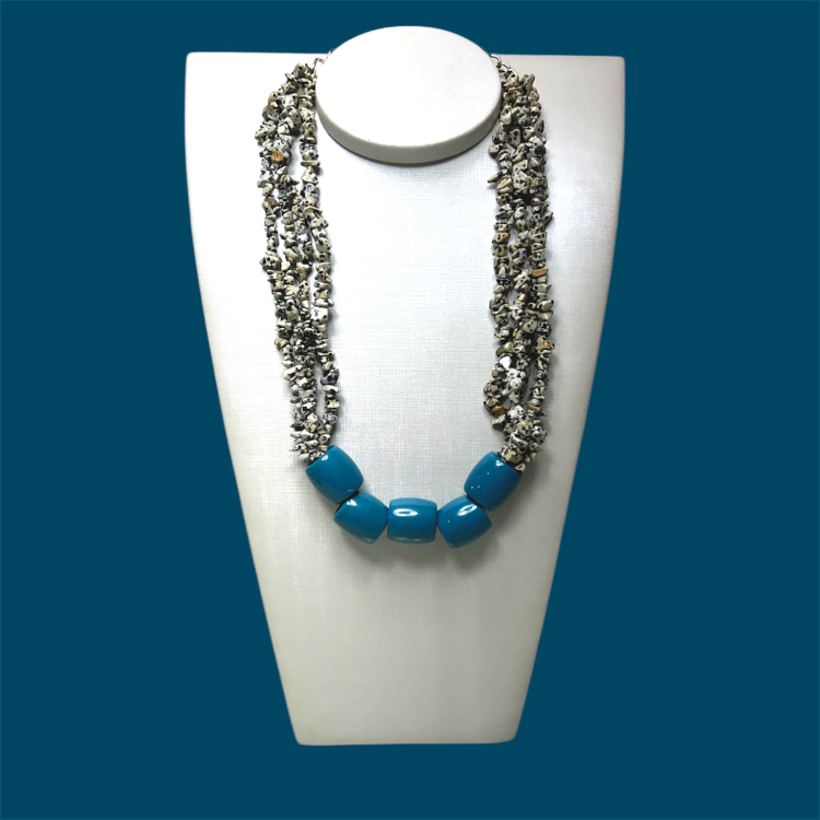 Feito com pedra ágata dálmata e cubos de acrílico.