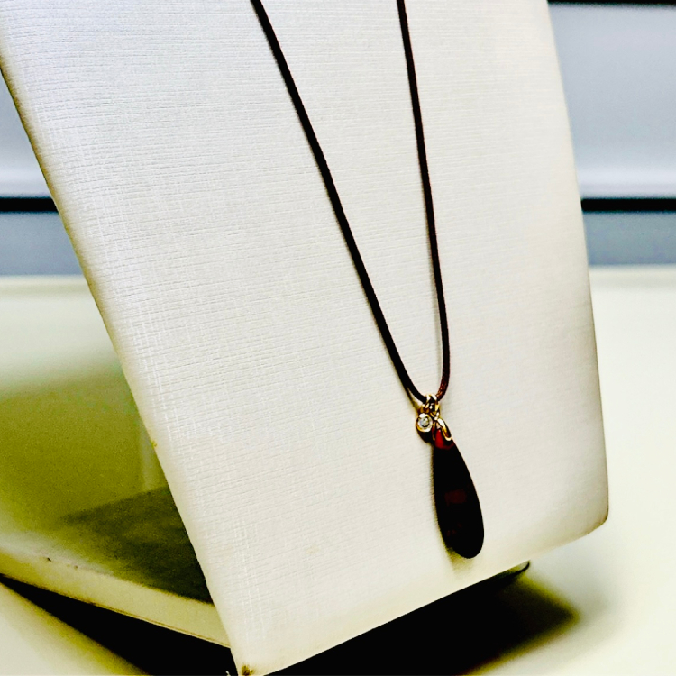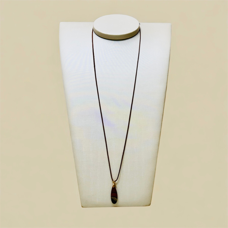 Feito com cordão, pingente de pedra jaspe e detalhes em banho de ouro e zircônia.