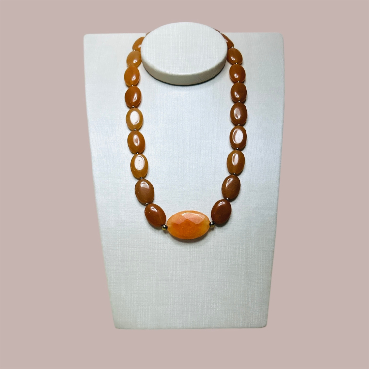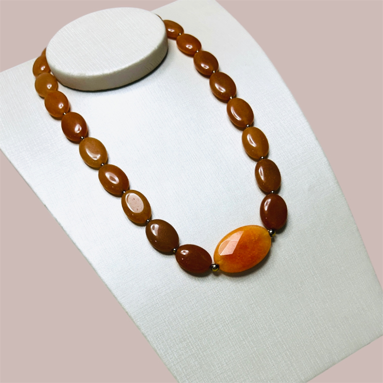 Feito com pedras aventureiras laranja, pedra jade laranja , entremeios de pedra hematita e fecho em banho de ouro.