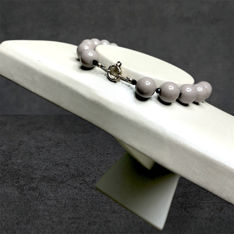 Feito com resina, entremeios de cristal sintético, fecho tipo bóia de prata , e pingente de prata e metal prateado.