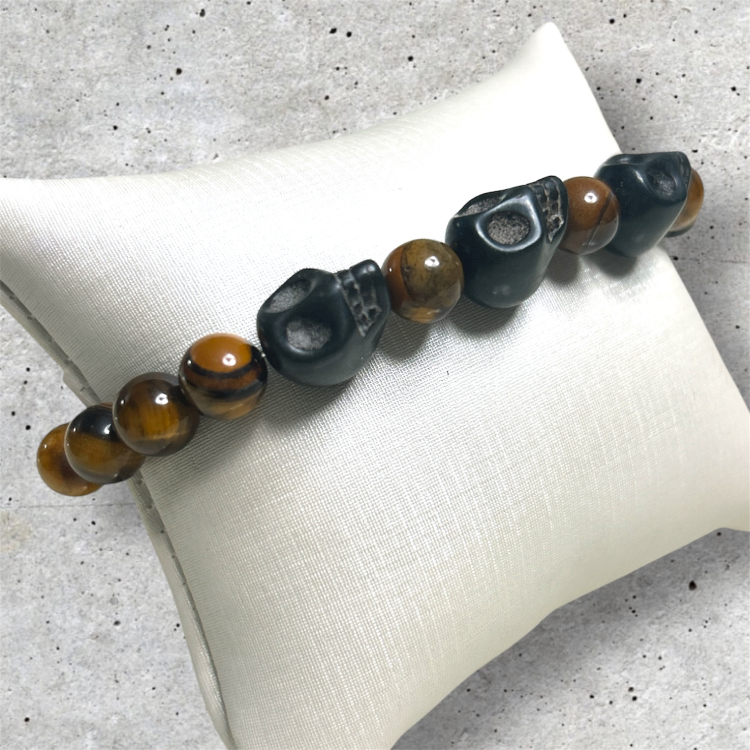 Feita com silicone, pedra olho de tigre, caveiras de pedra ágata e entremeios de metal.