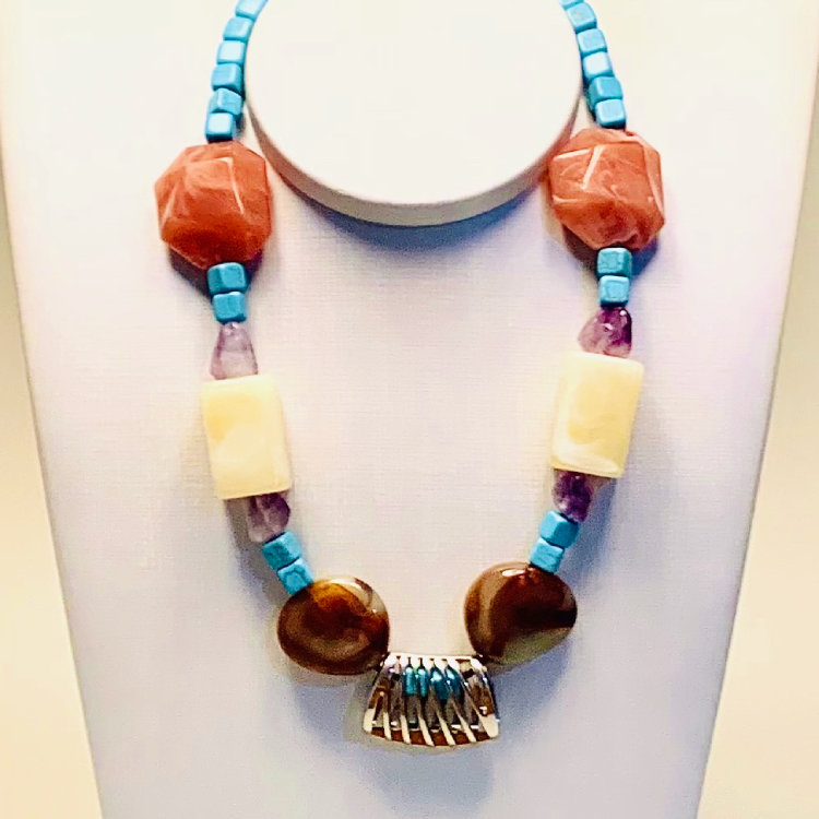 Conforme você se acostumar com a peça e desejar ir um pouco além, a dica é começar a misturar os tons e texturas do acessório com estampas que você pode encontrar no seu closet. Por exemplo, um maxi colar com pedras naturais em tons de laranja e amarelo pode ser combinado com um vestido que tenha uma estampa predominantemente amarela e/ou laranja.